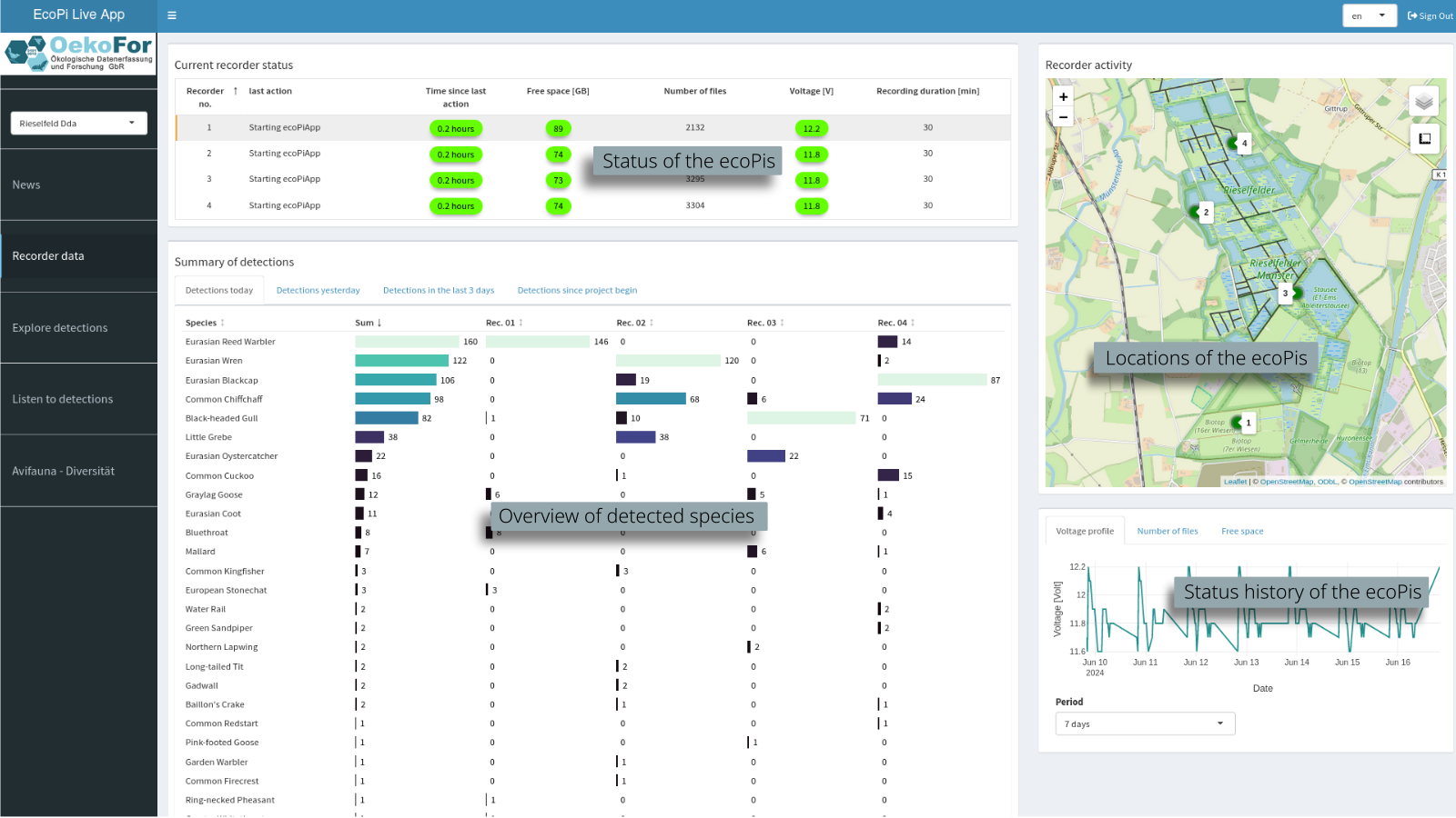 With the ecoPi LiveApp, we provide a clear dashboard in which the functioning of the ecoPis in the field can be monitored on a project-specific basis and transmitted data can be explored.